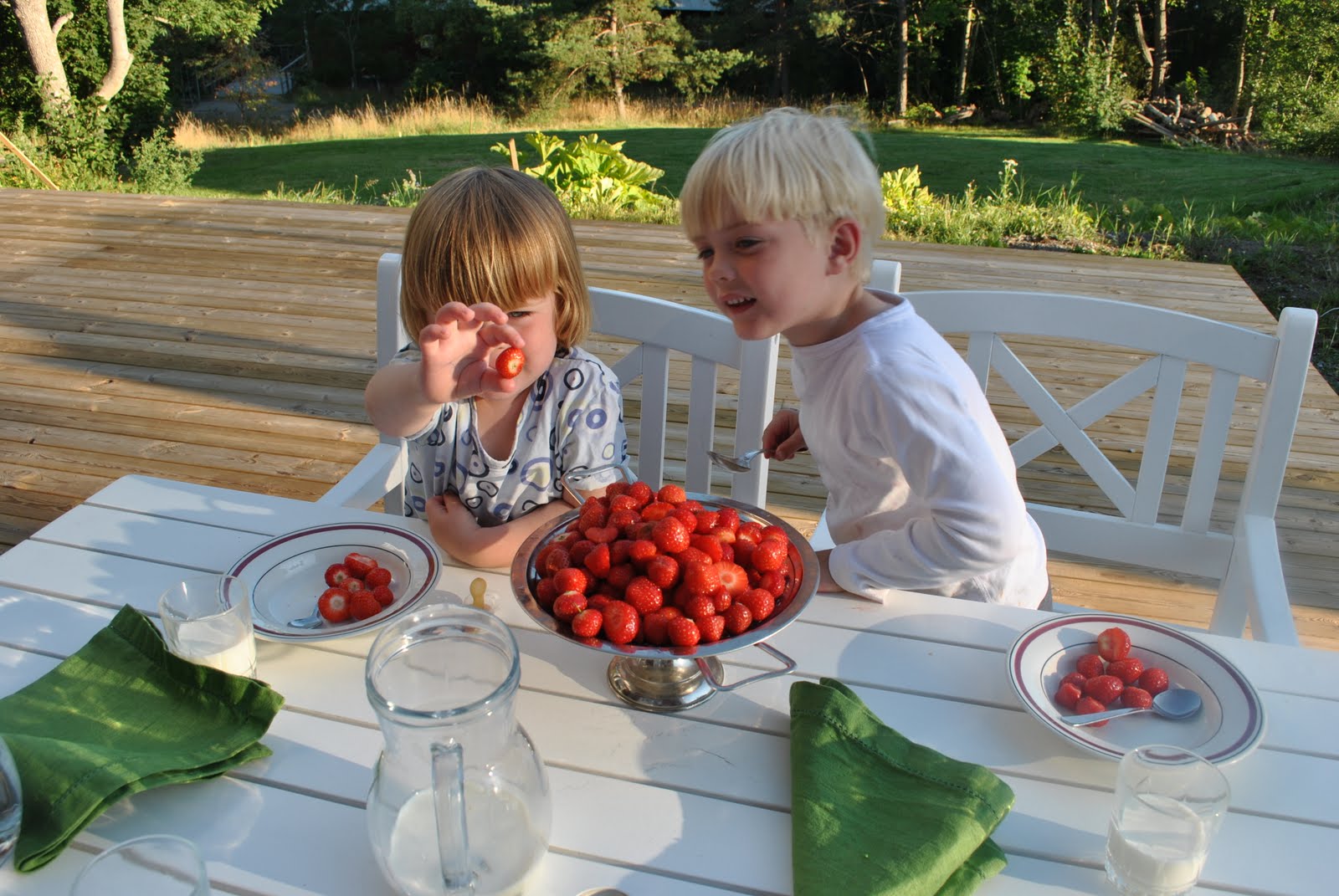 Det finns många efterrätter som är goda. Efter en heldag i affärer då vår sista (för denna gång) inköpta taklampa till hallen hade blivit omdragen i lampaffären, passade vi på att shoppa på oss 3 liter jordgubbar innan vi for hem. Färska jordgubbar med glass, eller än hellre med kaffegrädde - är inte det RIKTIG SOMMAR så säg.