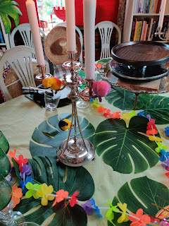 Mycket är redan gjort med ljusgrön duk, färgglada blomstergirlanger och stora plastblad som täcker större delen av bordsytan.
